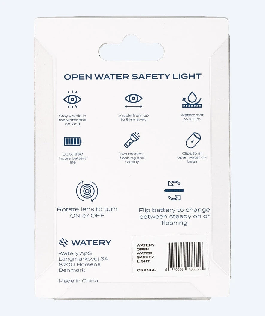 Open Water Safety light kommer med et medfølgende innsatt batteri, som har en levetid på opp til 250 timer. I tillegg er den vanntett ned til en dybde på 100 m og du har til og med mulighet for å skifte mellom et konstant eller et blinkende lys. Dette safety light er derfor det lyset med lengst batteritid på markedet, og det sikrer deg den største synligheten på åpent vann.