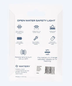 Open Water Safety light kommer med et medfølgende innsatt batteri, som har en levetid på opp til 250 timer. I tillegg er den vanntett ned til en dybde på 100 m og du har til og med mulighet for å skifte mellom et konstant eller et blinkende lys. Dette safety light er derfor det lyset med lengst batteritid på markedet, og det sikrer deg den største synligheten på åpent vann.